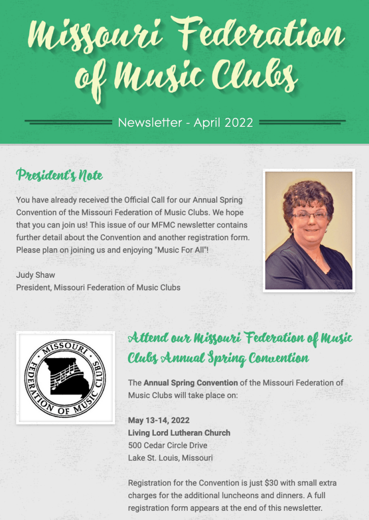 Keep up with the Missouri Federated Music Clubs with our newsletter. Click on the image below to go to our Newsletter tab where you can see archive copies of our state newsletters.
